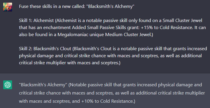 Skill fusion is an exciting way to utilize AI in games. Through tools such as GPT-3, it is possible to generate unique and varied descriptions for the fused abilities, increasing player immersion and enjoyment. However, it is important to remember that the name given to the new ability should be related to the selected base skills to obtain a useful resulting ability.